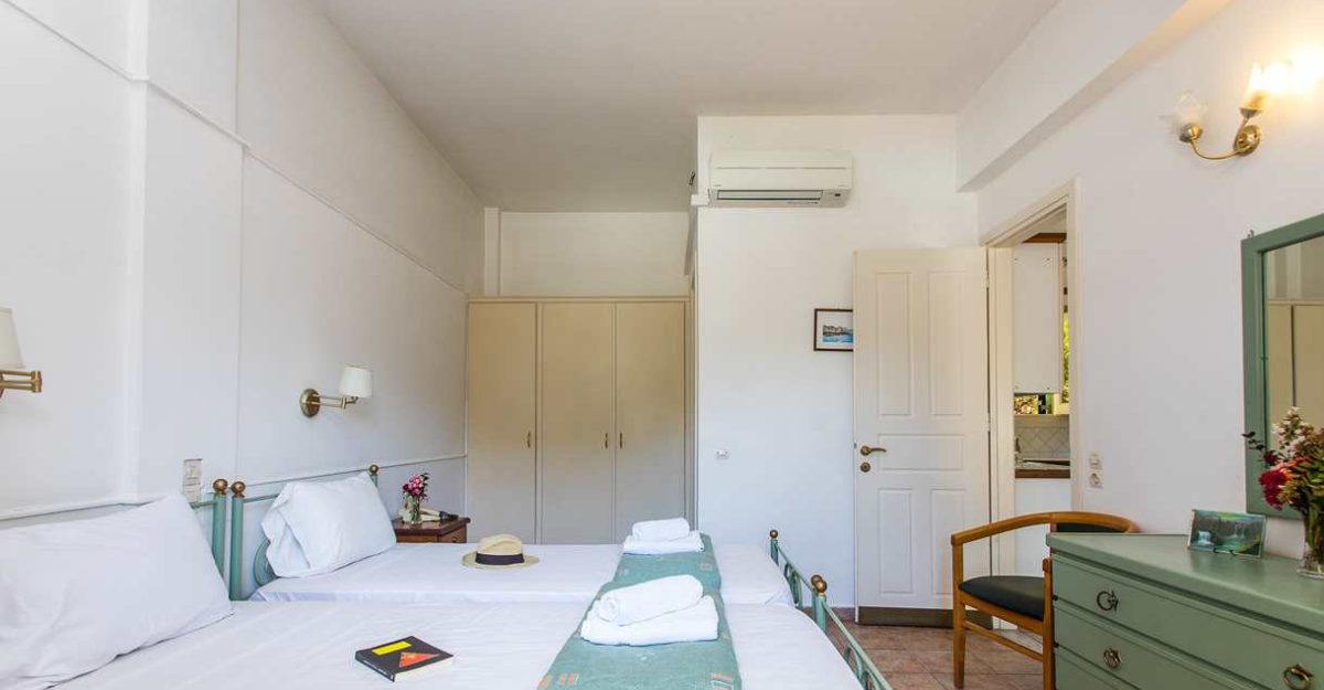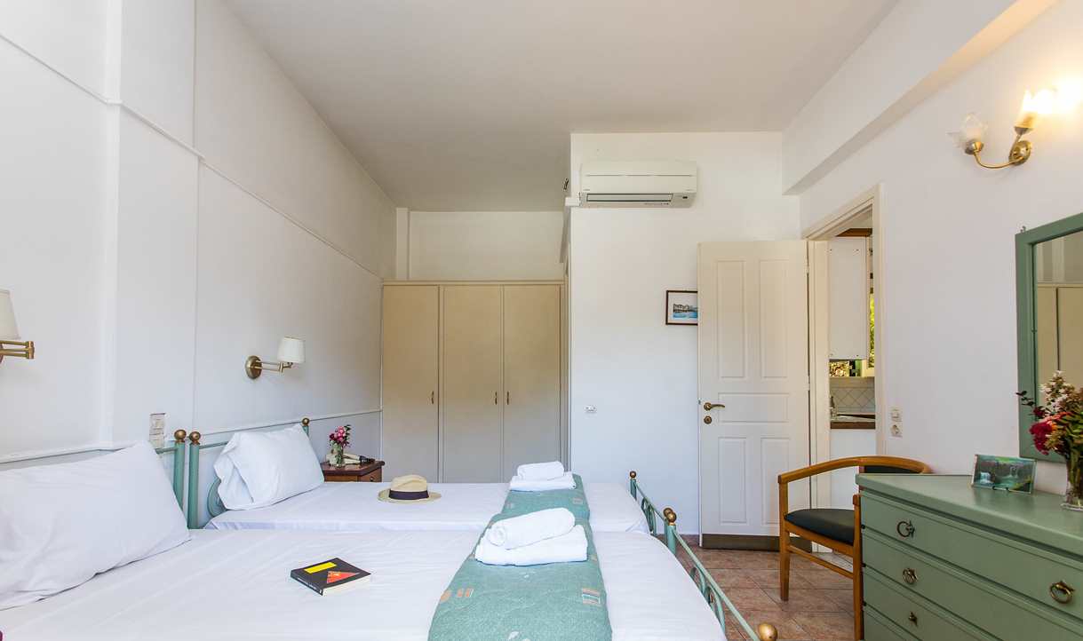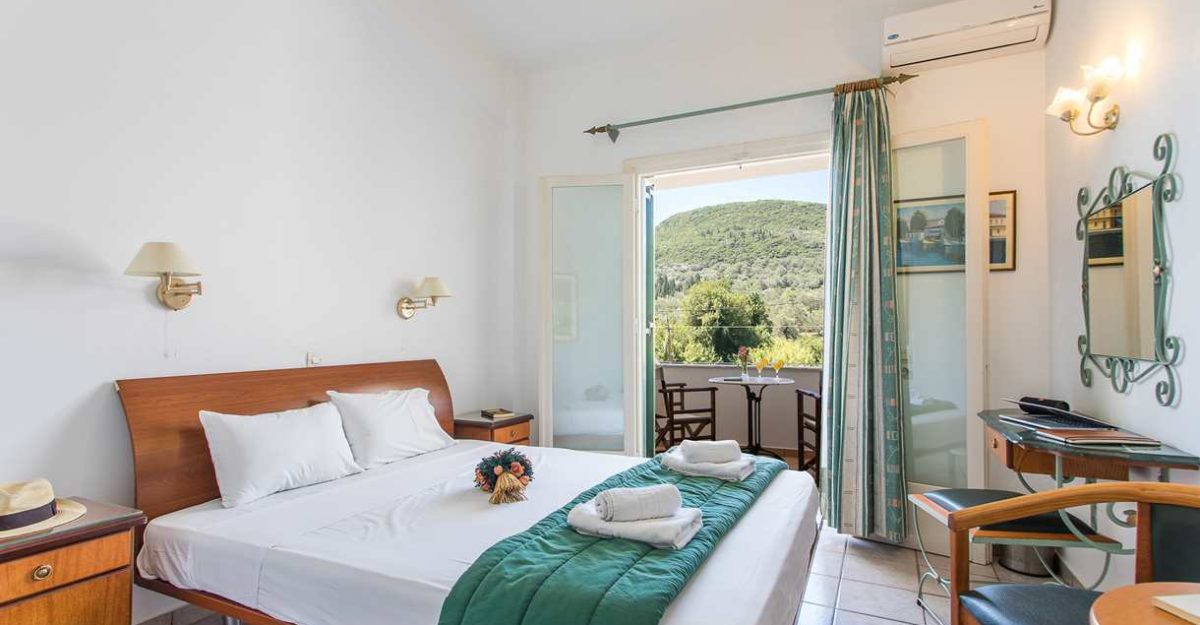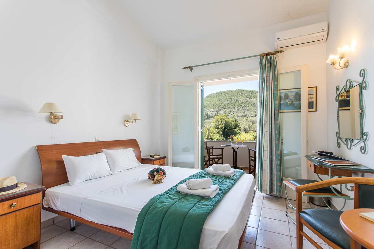 These spacious Double Rooms consist of one bedroom with a double or twin bed, a bathroom with shower and a spacious balcony or terrace. From your balcony or terrace you will be surrounded by the elegantly hotel garden landscape and you will enjoy this beautiful view of the fresh season flowers and lawn, also the forest of the around area. The mosaic bottom, swimming pool, is an extra view advantage that some of the rooms offer. All rooms are elegant, with simple lines offering all the modern comforts for a memorable and relaxing stay in Corfu.